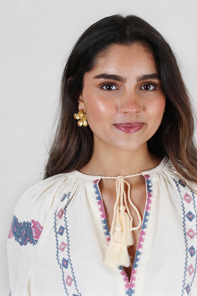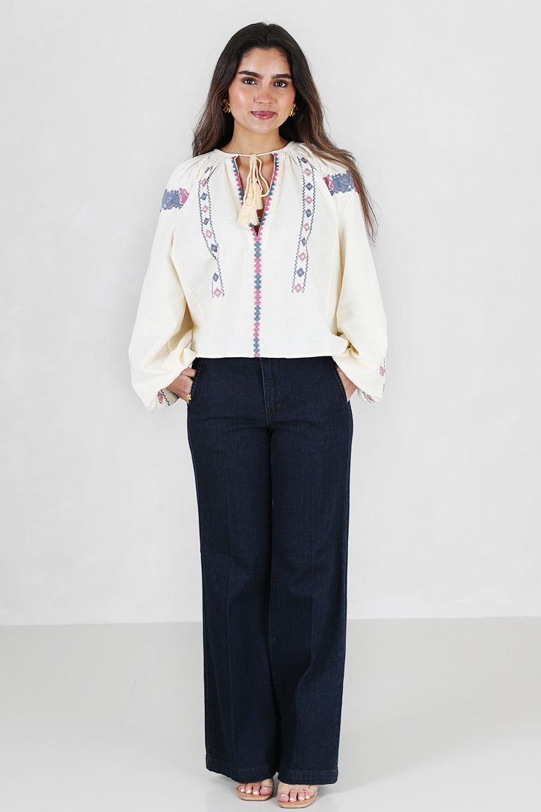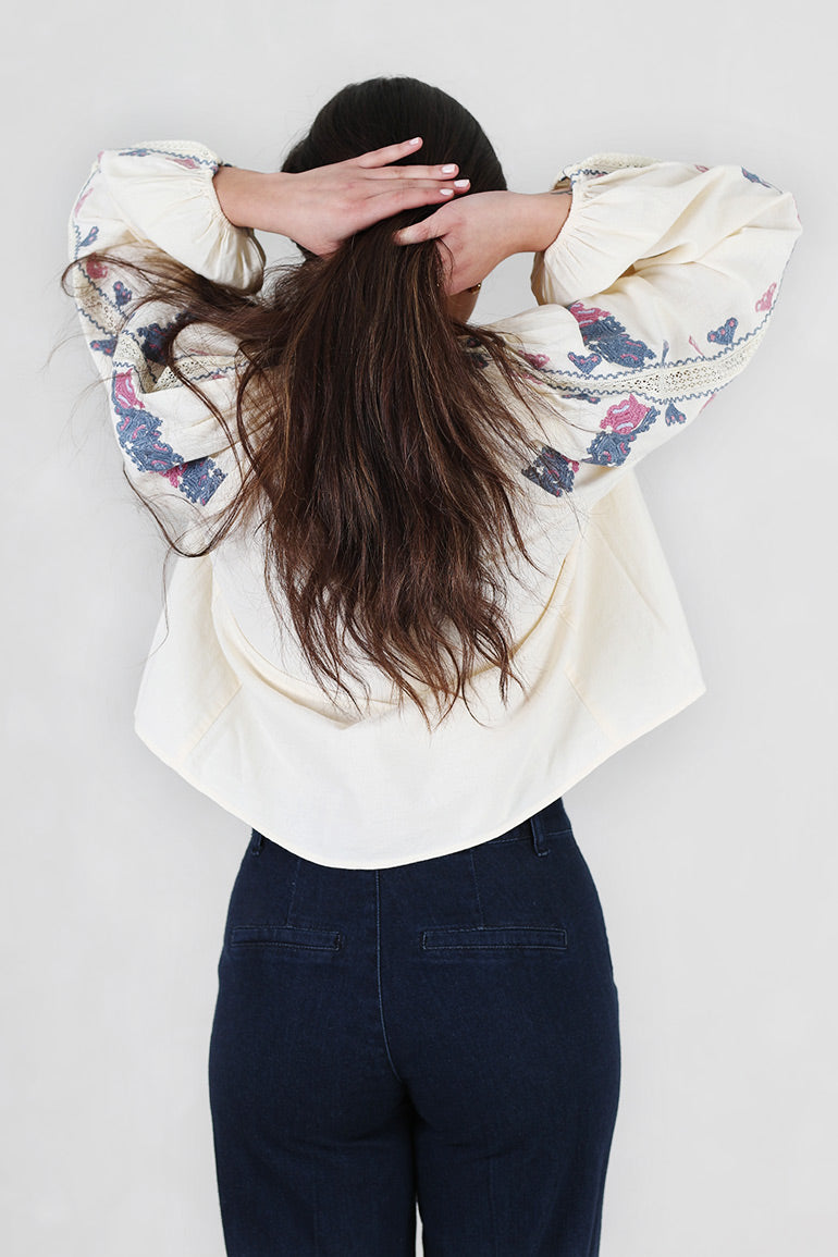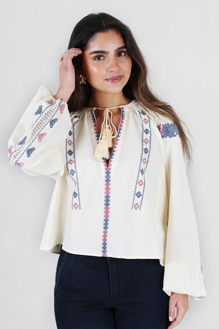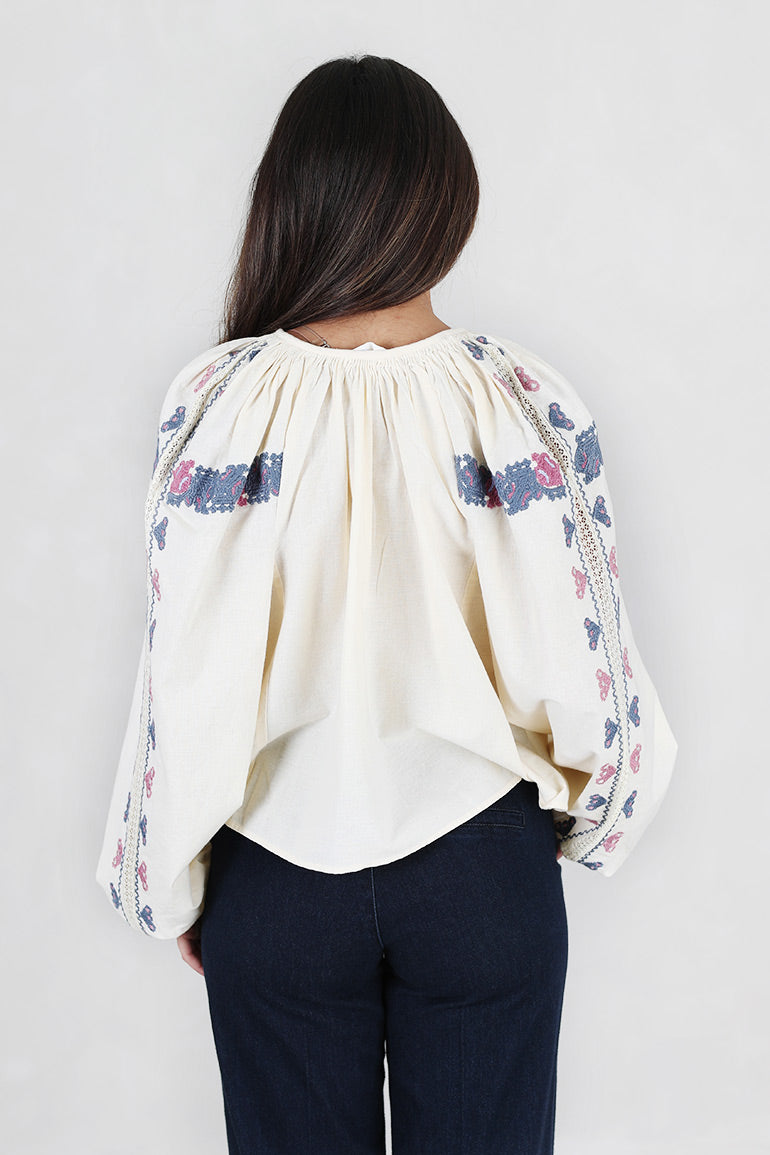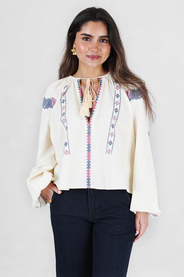 Helt nydelig bluse fra Pia Tjelta i offwhite bunn med deilig dusblått/rosa mønster. Lange ermer, v-hals med knyting i halsen. Strikk i ermene. Løs, litt kort modell.